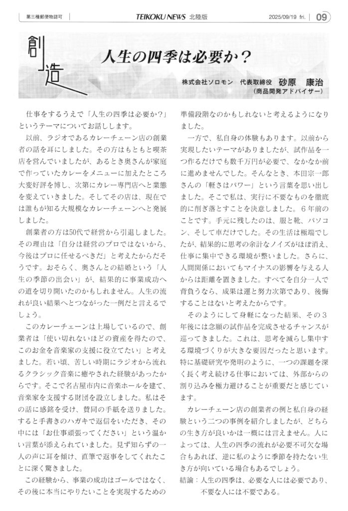 カレーチェーン店の創業者の例と私自身の経験という二つの事例を紹介しましたが、どちらの生き方が良いかは一概には言えません。人によっては、人生の四季の流れが必要不可欠な場合もあれば、逆に私のように季節を持たない生き方が向いている場合もあるでしょう。